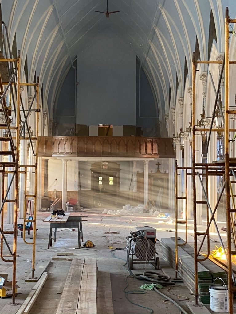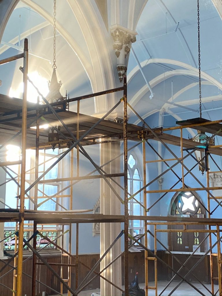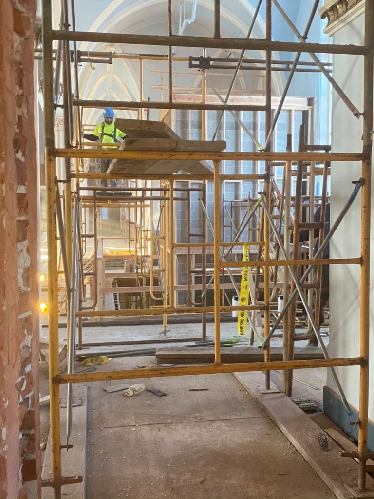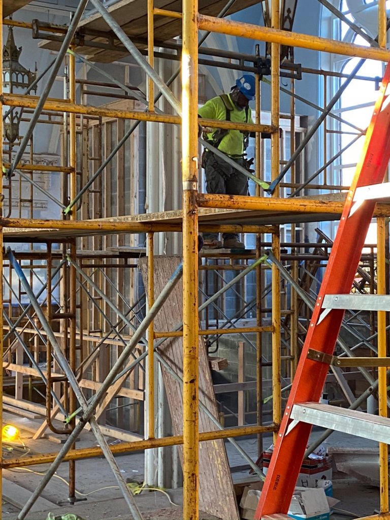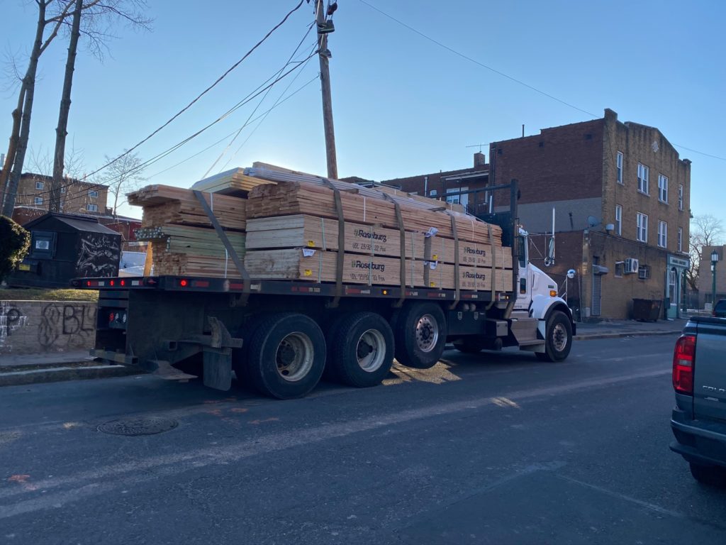 Friday Morning Renovation Goals: final scaffolding comes down, and truckload of lumber gets delivered!