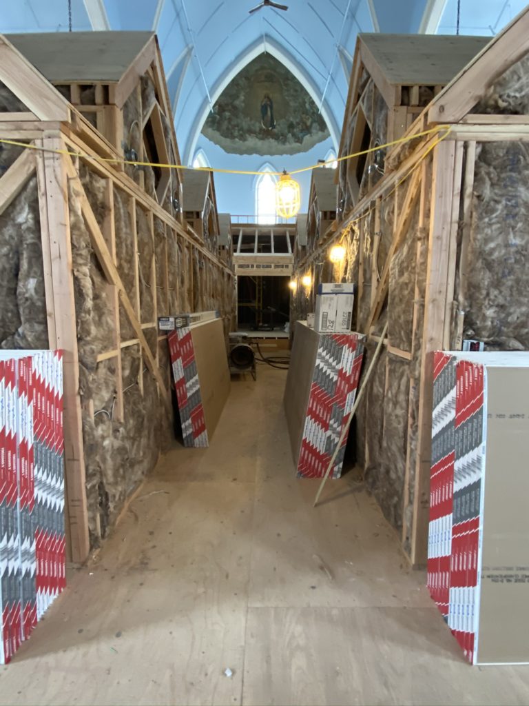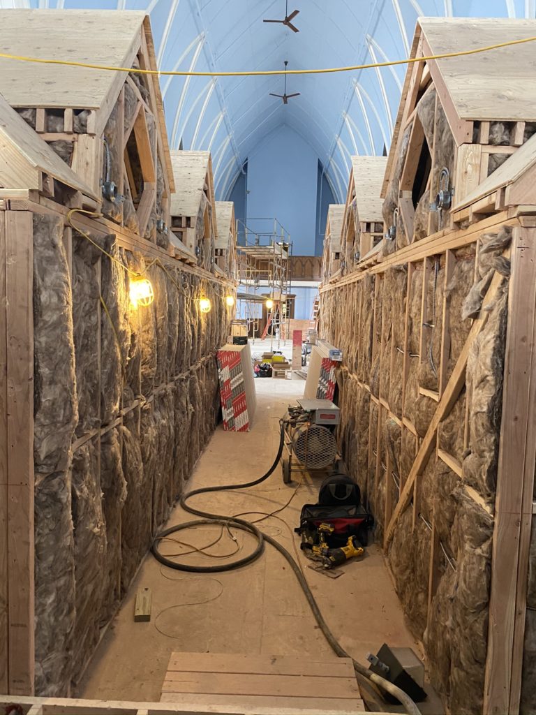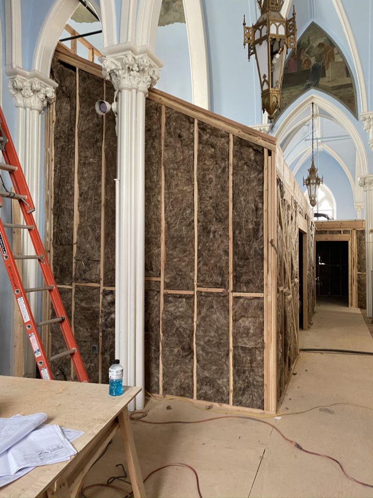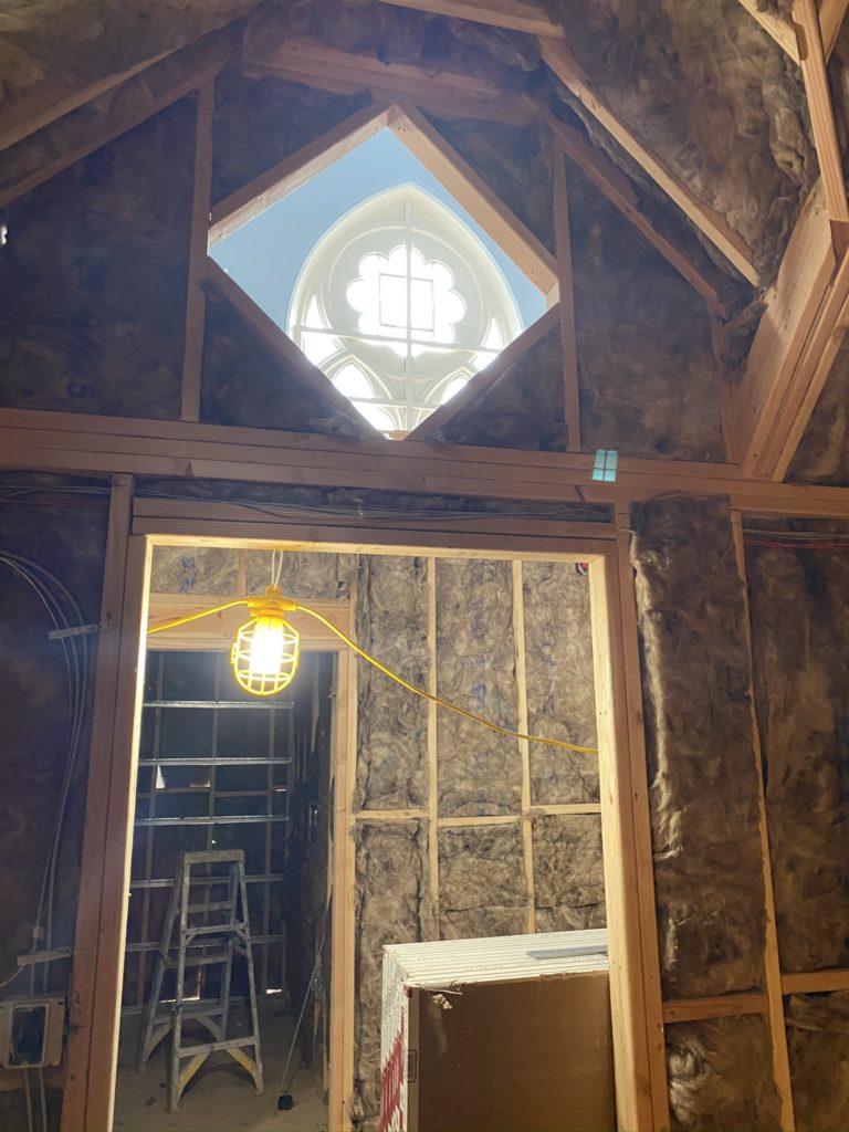 Earlier this week, insulation was installed throughout the building on what will soon enough be offices, a medical clinic, conference room, and by the dormitory area. More sprinklers were installed, and framing continues on the basement windows. Click on the photos for captions.