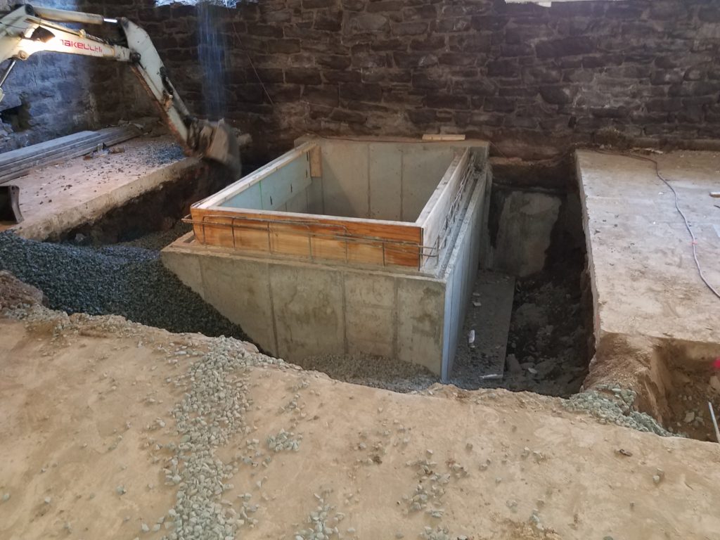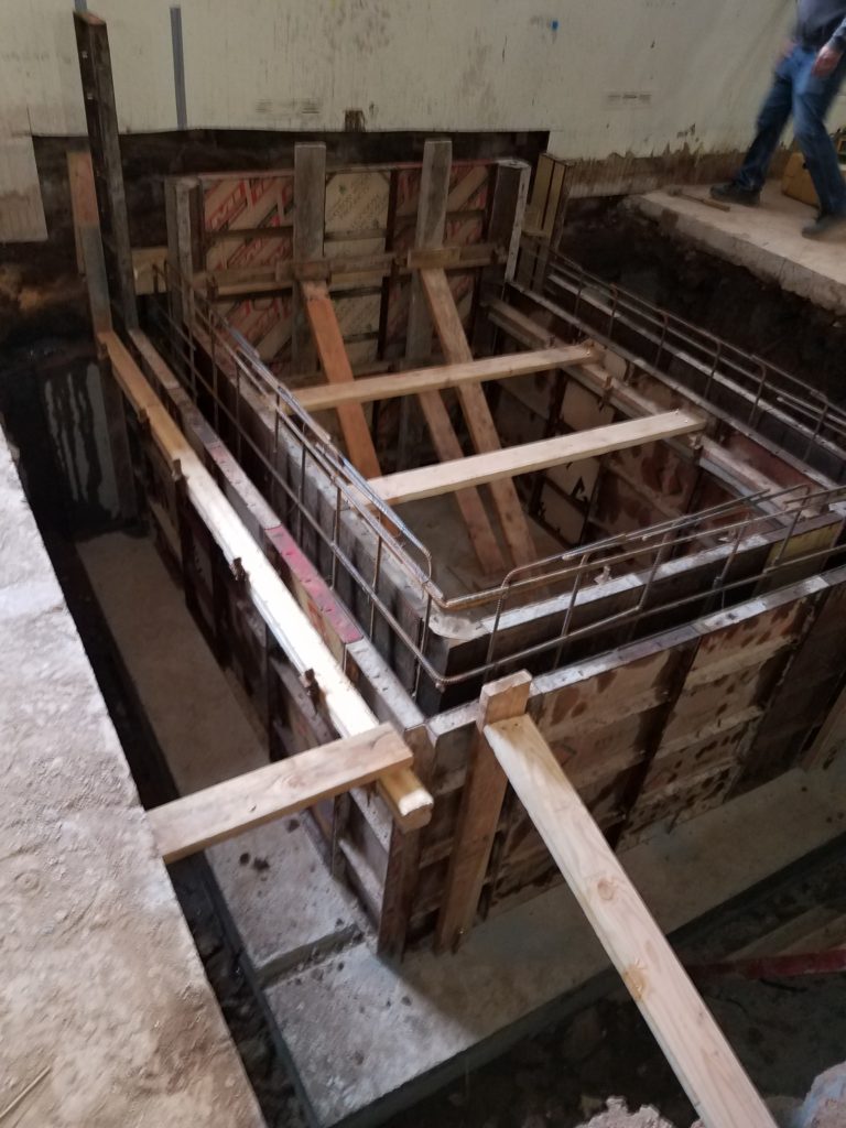The dirt has been removed, and gravel has filled the holes in the basement floor as it awaits concrete next week; and the elevator pit was framed out and shaft completed!