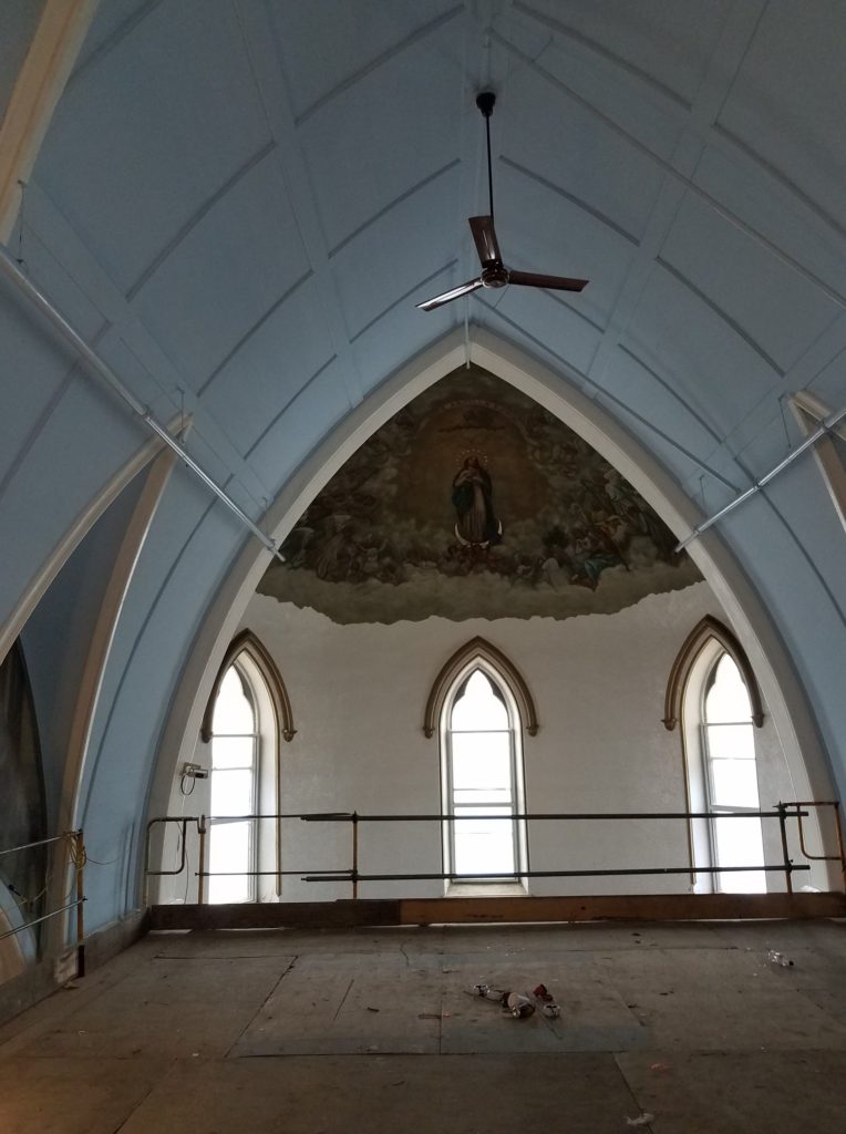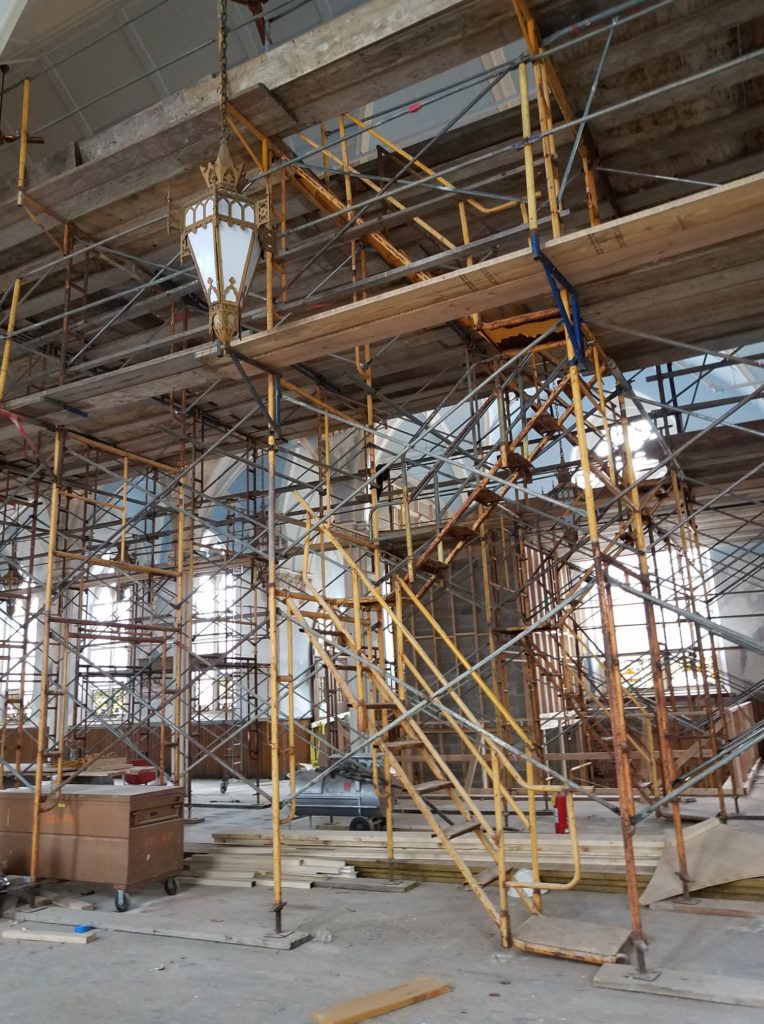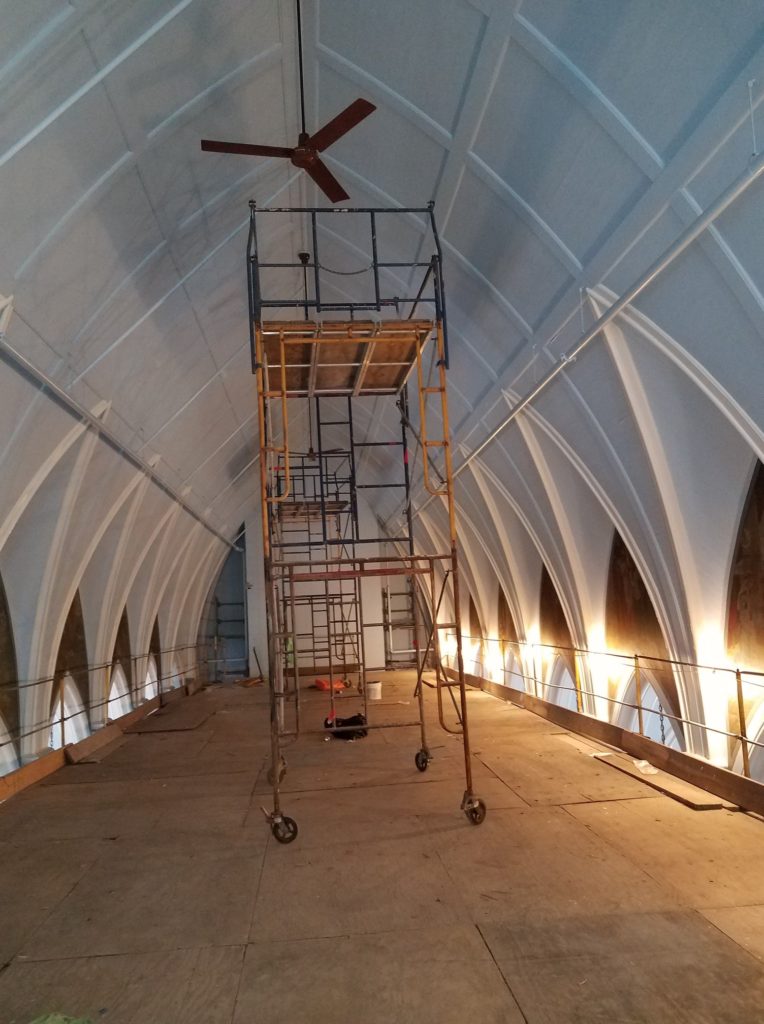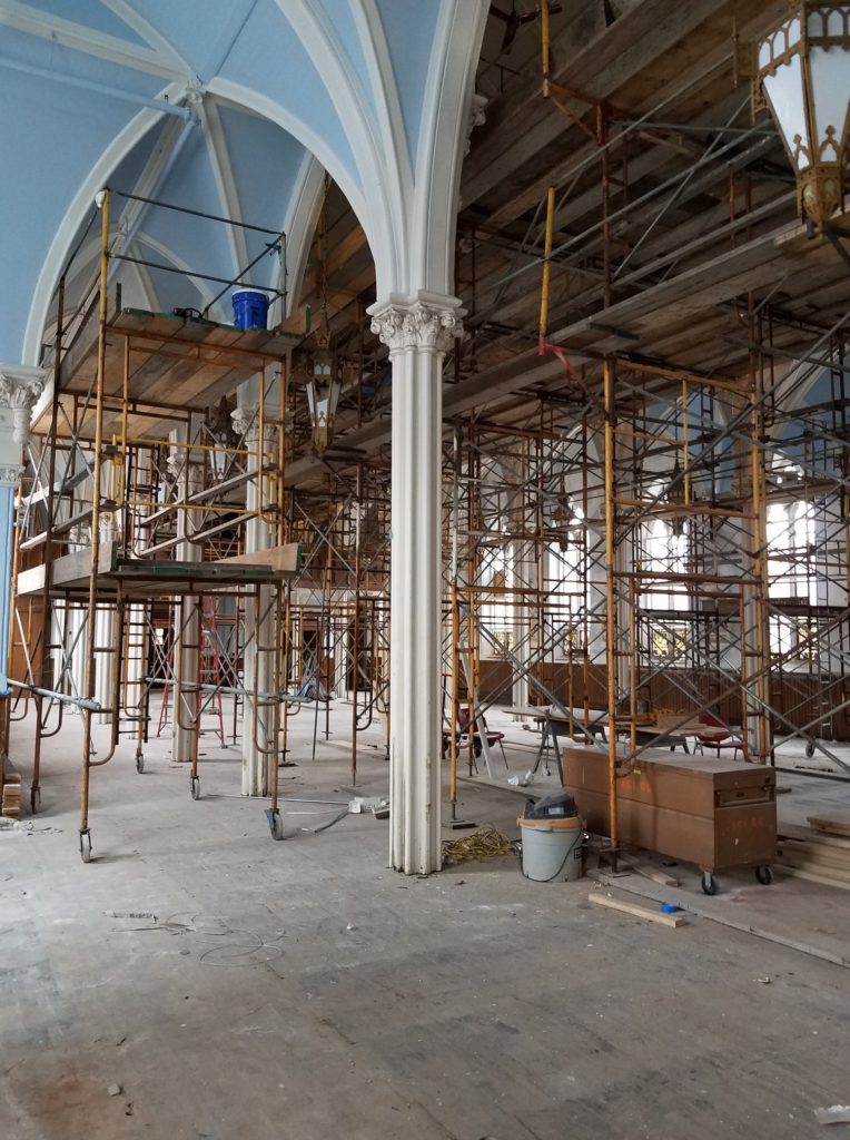 Now that the high work has been completed, including high painting and installation of new fans and sprinklers, the scaffolding will come down this week. We are all excited to see how the first floor of the former church will transform!